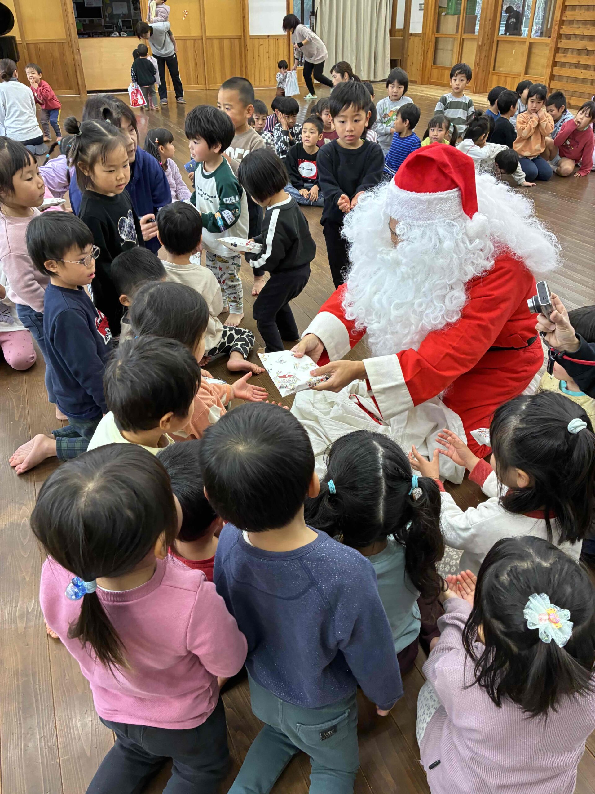 大きな袋の中から、ひとりひとりに手渡しでプレゼントをもらうと、子どもたちはちょっぴり緊張しながらも嬉しそうに受け取っていました。心がぽかぽかする、特別な時間になりました。