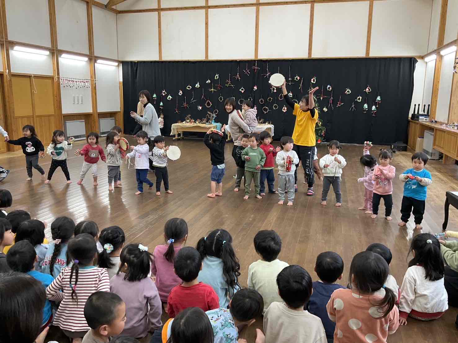 タンバリンや鈴を鳴らしながら体を揺らし、みんなでにこにこ踊る姿がとてもかわいらしかったです。