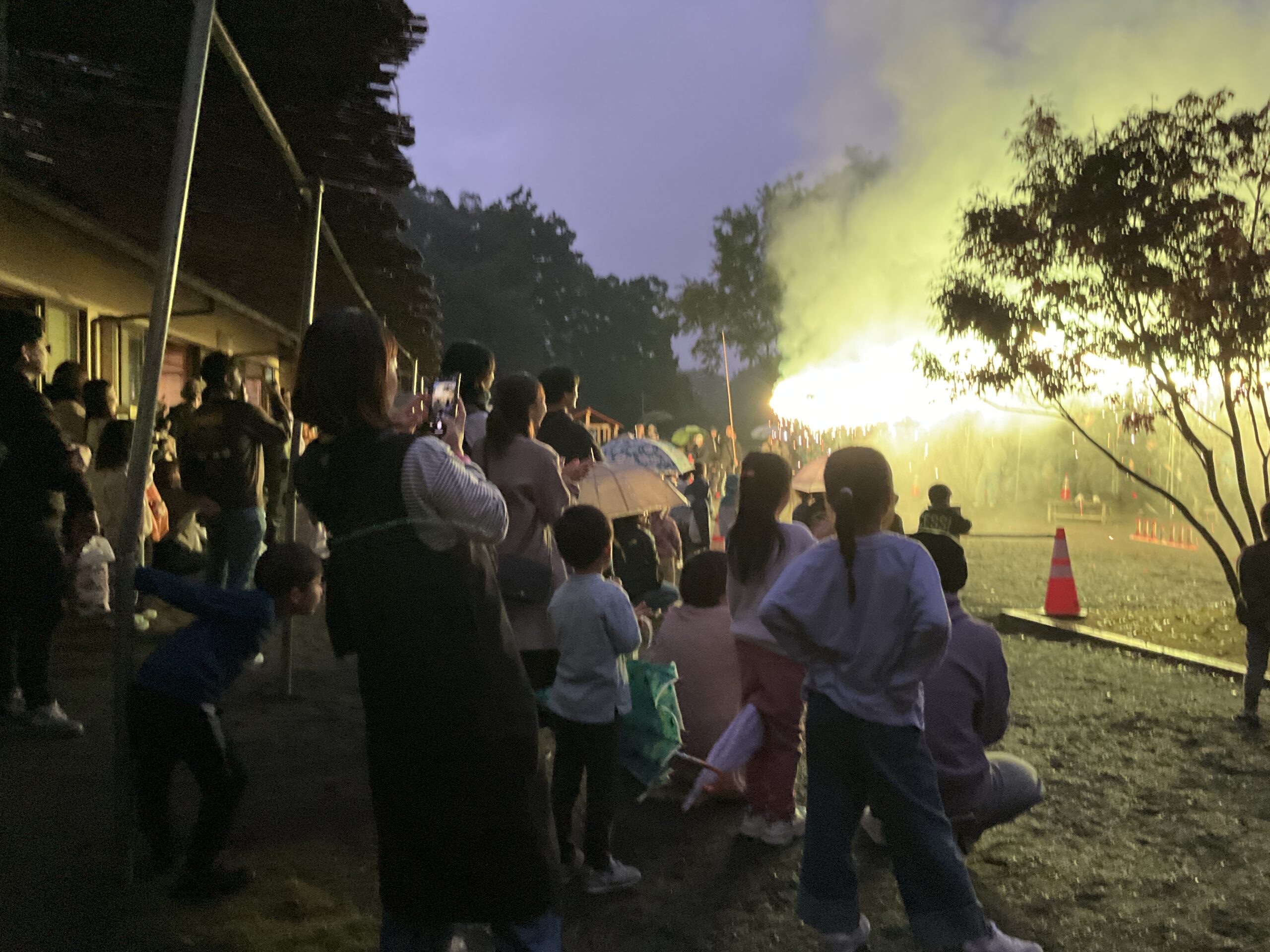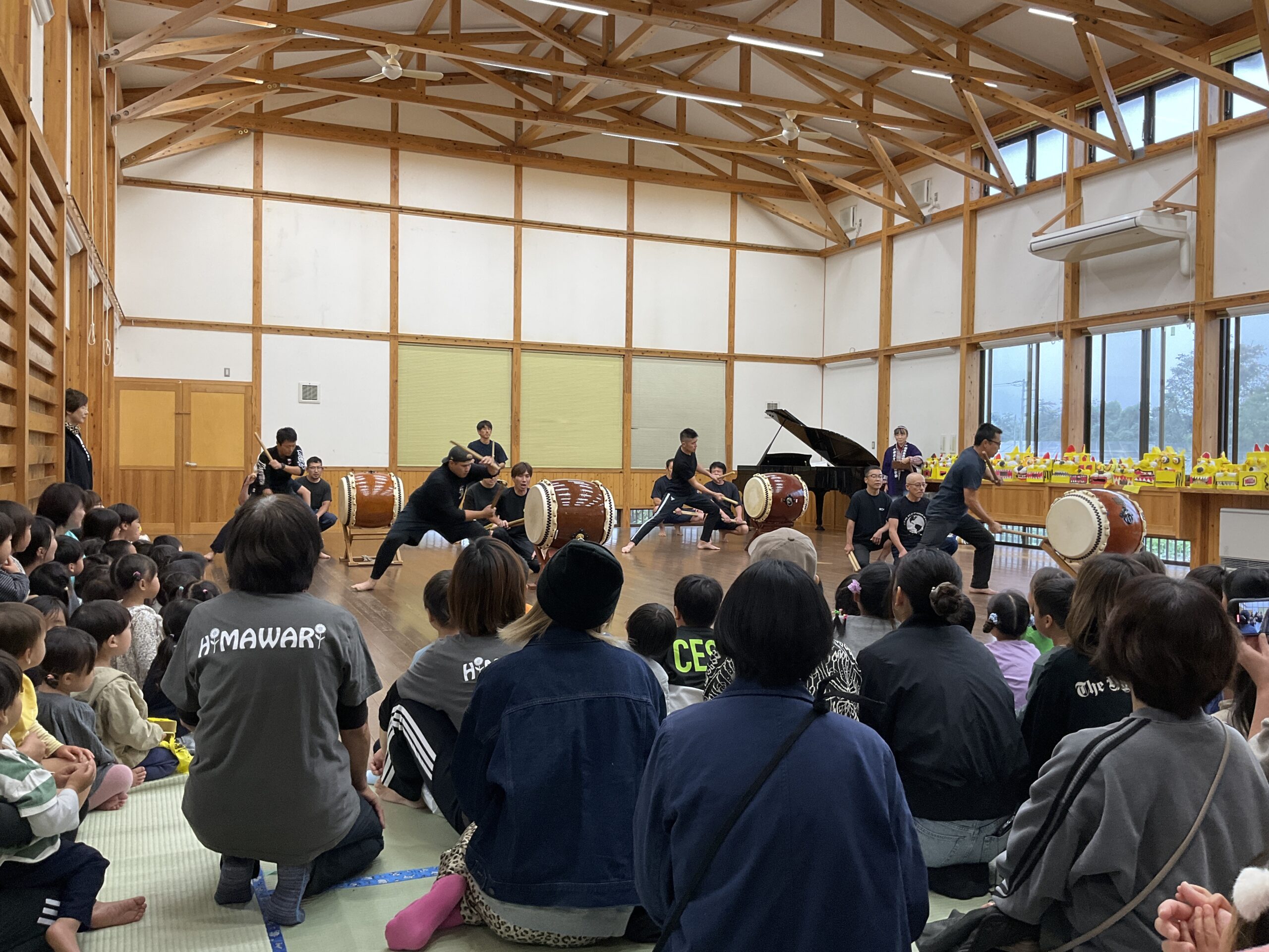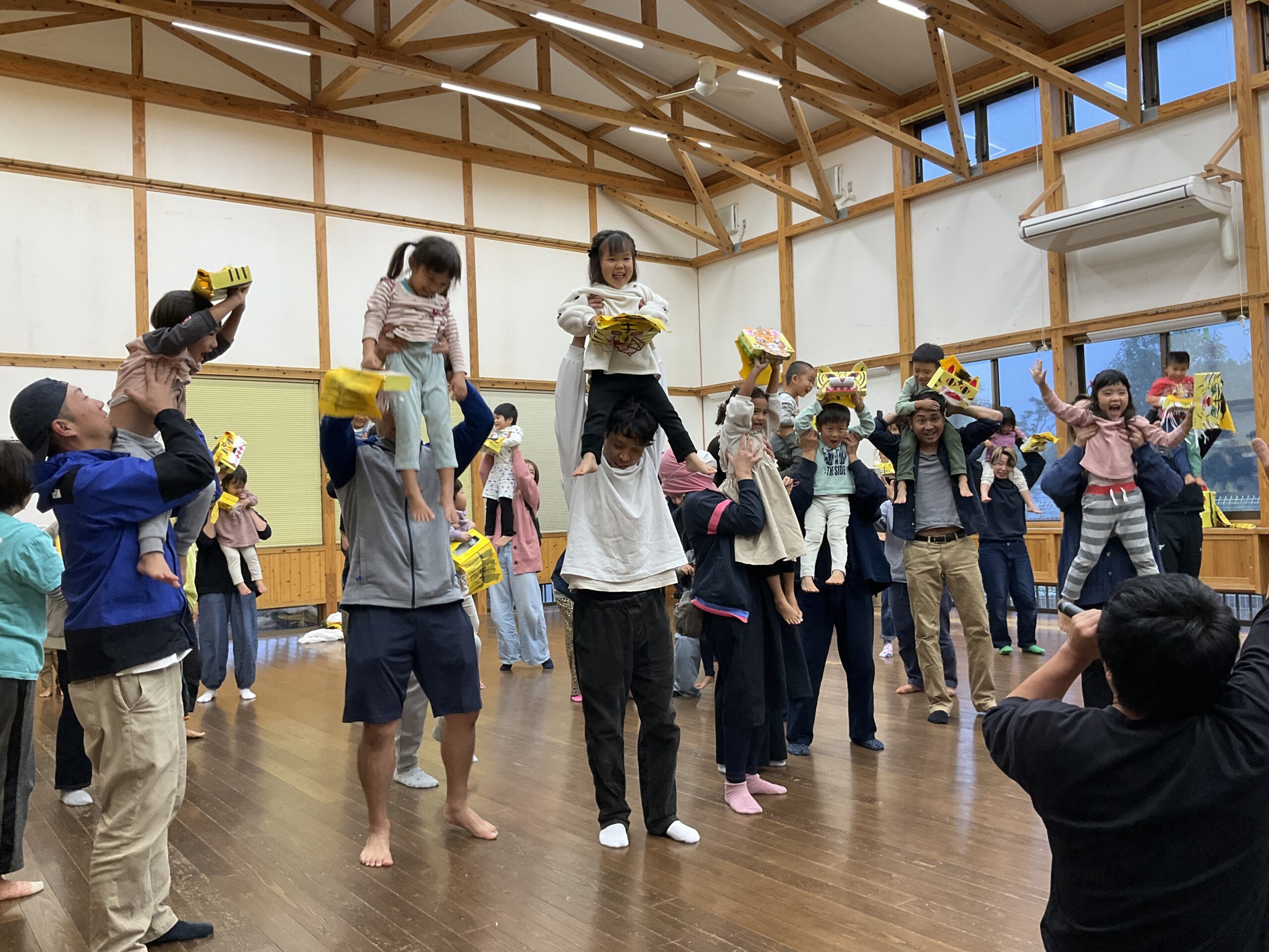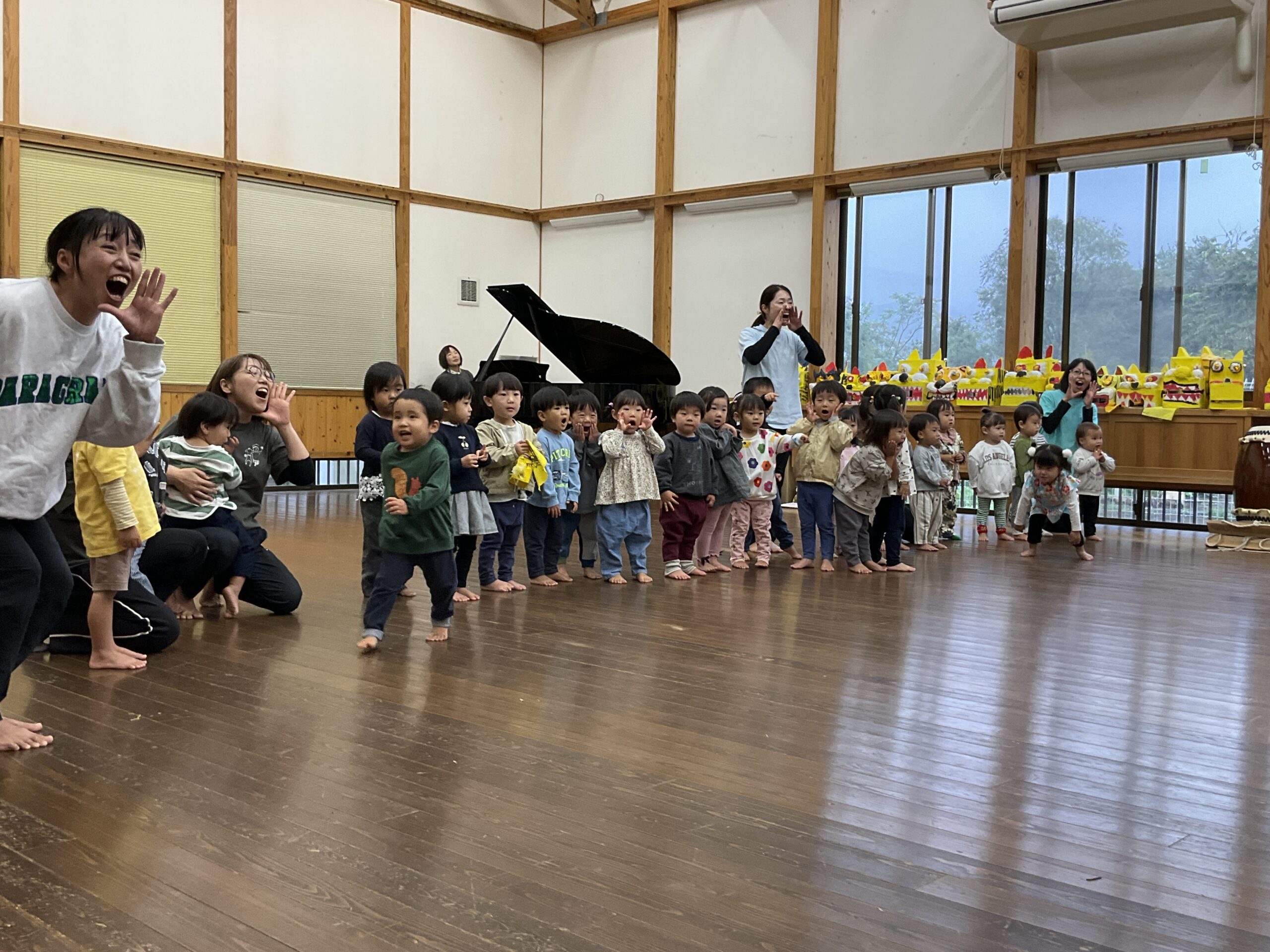 秋祭りをしました。午後から開始の予定が雨がポツポツ・・リズム室でのお祭りスタート。前日の夜まで練習を重ねた、お父さんたちによる『神着木遣り太鼓』とっても迫力があり素敵でした‼子どもたちは【風たちの秋のうた】【小鳥とぶどう】【風三郎 滝三郎】を歌いました。職員のよる虎舞を見た後には、親子で虎舞を踊りました♪ お楽し袋をもらい、最後が待ちにまった花火大会。目の前で打ちあがる綺麗な花火に、みんなくぎ付けでしたよ!太鼓の披露、花火の準備をしてくださったお父さんたち。役員の皆さん、進行や当日までの準備ありがとうございました☆彡